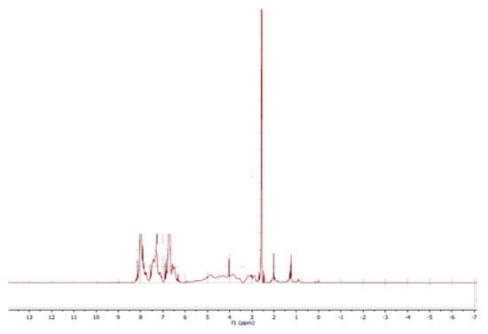 1H NMR spectra were recorded at Forschungszentrum Jülich, Jülich, Germany, using a Bruker 600 MHz spectrometer equipped with a 5 mm broadband CryoProbe Prodigy. The acquisition parameters were as follow: 90° pulse calibrated at 12 μs, 1.3 s acquisition time, 2 s relaxation time, no spinning, 300 K, and 2048 scans. Ultraviolet–visible spectroscopy was recorded using UV-1601 (SHIMADZU), and an IR spectrometer (Nicolet iS5, iD3 ATR, Thermo Scientific, Japan) was used in this work. In addition, thermogravimetric analysis was performed using a Q50 V20.10 TGA, Build 36 instrument at a heating rate of 10 °C/min in N2 gaseous atmosphere (New Castle, DE, USA). UV-Visible spectroscopy, IR and TGA analysis were obtained at An-Najah National University, Nablus, Palestine.