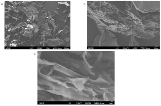 The obtained SEM images of Cell-F are shown in Figure 3. Three images were obtained at three different magnifications (1, 10, and 100 µm). As shown below, the polymer is highly porous, with a high surface-to-volume ratio, which enhances the adsorption efficiency of the polymer.