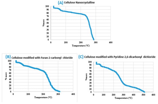 TGA analysis results for (A) Cellulose nanocrystal, (B) Cellulose modified with Furan-2-carbonyl chloride (Cell-F), (C) Cellulose modified with Pyridine-2,6-dicarbonyl dichloride (Cell-P).
