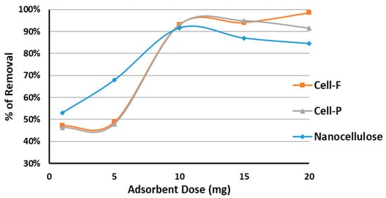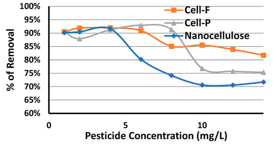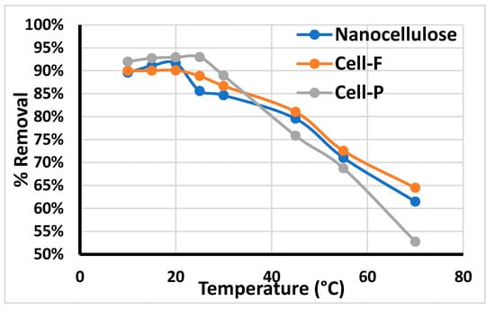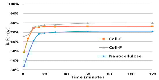 This highest removal was about 81.5% for both Cell-F and Cell-P. The cellulose nanocrystal showed a lower efficiency, and the percentage removal was about 79%.