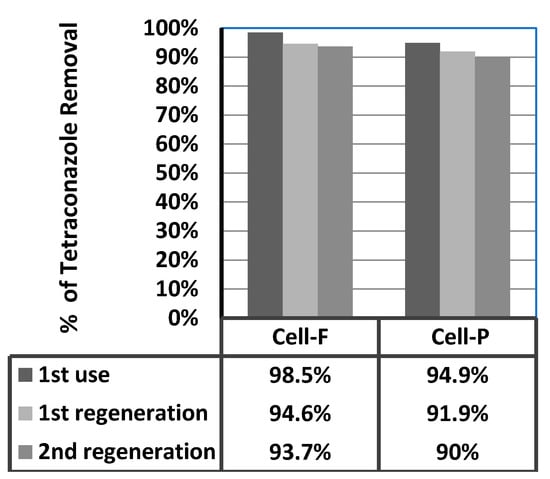 Effect of adsorbent recovery on tetraconazole adsorption on Cell-F and Cell-P (solution volume = 10 mL).