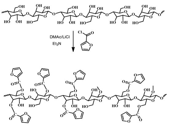 To the cellulose solution in LiCl/DMAc prepared before was added trimethylamine (0.5 mL) dropwise under N2, followed by a solution of furan-2-carbonyl chloride (2.415 g, 0.0185 mol) in 10 mL of DMAc. The produced reaction mixture was stirred for 3.0 h at 70 °C. It was then transferred to a beaker containing 500 mL of distilled water, and the produced precipitate was collected by suction filtration, washed several times with distilled water and with isopropyl alcohol, and then dried at room temperature.
