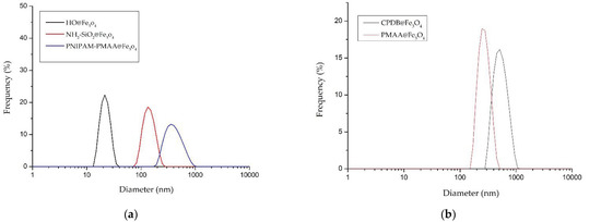 HO@Fe3O4 and NH2-SiO2@Fe3O4 were observed under SEM to determine their structures. As shown in Figure 1a,b, both HO@Fe3O4 and NH2-SiO2@Fe3O4 are spherical-shaped, and amine-functionalized particles have an evidently larger size compared with HO@Fe3O4. As shown in the DLS pattern (Figure 2, Table 1), the hydrodynamic diameter of HO@Fe3O4 is around 20 nm. After amine functionalization, the size of particles increased to around 300 nm. Particle sizes modified with CPDB and MAA were analyzed in DMF since they were not well dispersed in water. Compared to the above-mentioned particles, particles modified with CPDB, MAA, or NIPAM did not seem to increase in size as their hydrodynamic diameters roughly ranged from 200 to 500 nm.