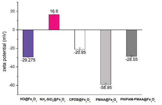 Zeta-potential analysis of HO@Fe3O4, NH2-SiO2@Fe3O4, CPDB@Fe3O4, PMAA@Fe3O4, and PNIPAM-PMAA@Fe3O4 in dd-H2O.