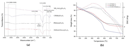 NH2-SiO2@Fe3O4, CPDB@Fe3O4, PMAA@Fe3O4, and PNIPAM-PMAA@Fe3O4 were analyzed via FTIR. As shown in Figure 4, NH2-SiO2@Fe3O4 can be identified through the signal presence of the Si-O bond at 1200 nm. CPDB@Fe3O4, PMAA@Fe3O4, and PNIPAM-PMAA@Fe3O4 can be identified through the presence of the carbonyl group (C=O) at 1760 nm (stretching) and the benzene derivative signal at around 680–700 nm, inferring the attachment of the RAFT agent. Besides, the pattern of PNIPAM-PMAA@Fe3O4 also contains a sharp signal at 1466 nm (bending), indicating the presence of CH2. Particles modified with monomers were characterized through thermogravimetric analysis (TGA). CPDB@Fe3O4 and PMAA@Fe3O4 had subtle significant differences in the TGA graphs. The weight loss of CPDB@Fe3O4 and PMAA@Fe3O4 was 92% and 91%, respectively. The 1% loss indicates the attachment of the MAA. The pattern of PNIPAM-PMAA@Fe3O4 was similar to the above-mentioned polymers, but an obvious steep reduction could be seen when heated up to 400–500 °C and a further loss to the mass to 89%. Through the slight variations, we could confirm that NIPAM was polymerized onto the particles. In Figure 4b, we also analyze the differential scanning calorimetry (DSC) of PNIPAM-PMAA@Fe3O4.
