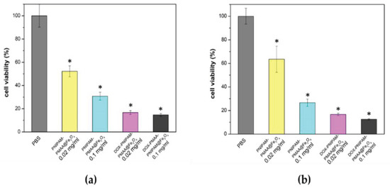 Cell viability analysis. (a) Cell viability analysis of the MDA-MB-231 cell line treatment for 48 h. (b) Cell viability analysis of the MDA-MB-231 cell line treatment for 72 h. * t-test: P-values of less than 0.05 was considered statistically significant. Our data here, * P < 0.01 versus PBS (n = 3).
