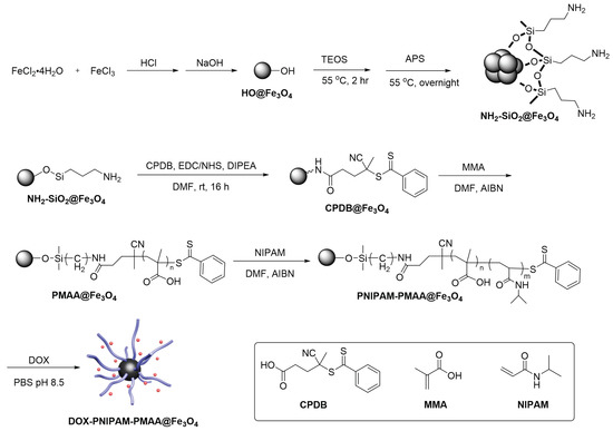 Synthesis scheme of doxorubicin (DOX)-loaded dual-responsive nanoparticles (DOX-PNIPAM-PMAA@Fe3O4).