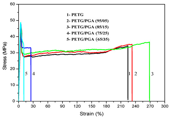 The tensile yield strengths, tensile moduli, and elongation at break values of PETG/PGA binary samples with various PGA contents are listed in Table 2. The typical stress–strain curves are shown in Figure 2.