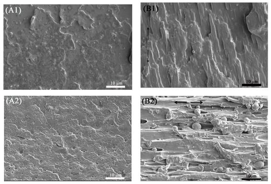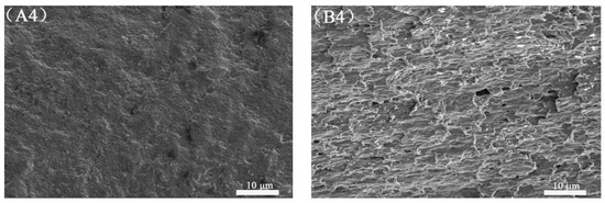 SEM images (×3000) of cryofractured surfaces of PETG/PGA/ADR tensile fractured specimens along tensile direction. (A) unstretched part ((A1)—65/35/0; (A2)—65/35/0.3; (A3)—65/35/0.6; (A4)—65/35/0.9); (B) stretching-oriented part ((B2)—65/35/0.3; (B3)—65/35/0.6; (B4)—65/35/0.9).