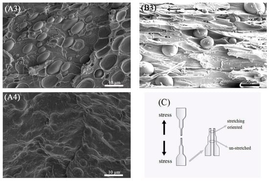 SEM images (×3000) of cryofractured surfaces of PETG/PGA tensile fractured specimens along tensile direction. (A) unstretched part ((A1)-95/5, (A2)-85/15, (A3)-75/25, (A4)-65/35), (B) stretching-oriented part ((B1)-95/5, (B2)-85/15, (B3)-75/25), and (C) sketching diagram of cryofractured surfaces along tensile direction.