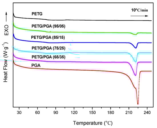 DSC and WAXD analysis were used to evaluate the crystallization properties of PETG/PGA blends with different PGA contents. The heating DSC thermograms of neat PETG, PGA, and PETG/PGA binary samples are shown in Figure 4. The corresponding thermodynamic parameters are summarized in Table 3.
