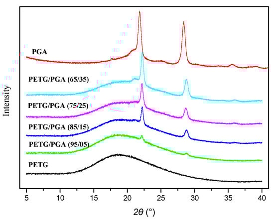 The WAXD patterns of the PETG/PGA binary samples with various PGA contents are shown in Figure 5. For comparison, the WAXD patterns of the neat PETG and neat PGA are also provided. Consistent with the DSC results, the WAXD pattern of the neat PETG showed a dispersive diffraction peak in the range of 2θ = 10° to 35°, indicating that the neat PETG was amorphous. Neat PGA showed two sharp diffraction peaks at 2θ = 21.8° and 28.4°, corresponding to the (110) and (020) planes of PGA crystals, respectively [25,26,27]. In the WAXD pattern of PETG/PGA (95/5), two sharp diffraction peaks at 22.2° and 28.9° were characteristic of PGA crystals. Moreover, the dispersive diffraction peak from 2θ = 10° to 35° indicated that the PETG matrix was completely amorphous. With an increase in PGA content, the two diffraction peaks characteristic of PGA crystals in the binary samples increased gradually, as expected.