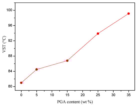The VST is one of the most important parameters for evaluating the heat resistance of a thermoplastic polymer. For an amorphous thermoplastic resin, the VST is strongly affected by its Tg. Due to its low Tg (ca. 75.0 °C), neat PETG showed poor heat resistance, which limits its applications at high temperatures. The relationship between the VST and PGA content is shown in Figure 6. As expected, the heat resistance of the PETG/PGA blends increased with an increase in PGA content. When the PGA content increased from 0 to 35 wt%, the VST increased from 81.0 °C (neat PETG) to 99.2 °C. This could be attributed to the reinforcement of the PGA particles on the amorphous PETG matrix, owing to the rigidity and semicrystalline nature of PGA.