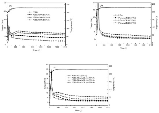 Rheological tests of neat PETG, neat PGA, and PETG/PGA (65/35) blends with and without ADR were carried out by torque rheometry, and the results are shown in Figure 8. Experiments were conducted to study the chain extension reaction of the polyesters as a function of the mixing time in the molten state. Figure 8(A,B) show that the torque curves of neat PETG and neat PGA gradually shifted upward with an increase in ADR content. According to previous research [20,28,29,30], the multifunctional epoxide groups of the chain extender could react with both the carboxyl and hydroxyl end groups of many kinds of polyester. The resultant chain extension/branching reactions are responsible for the increase in melt viscosity of polyesters during melt processing. Theoretically, the multifunctional epoxide groups of ADR could react with both the carboxyl and hydroxyl end groups of PETG or PGA chains. This led to chain extension/branching reactions between the polyesters and ADR. Hence, the increase in viscosity could be explained by the formation of chain extended/long-branched PETG or PGA chains with ADR modification.