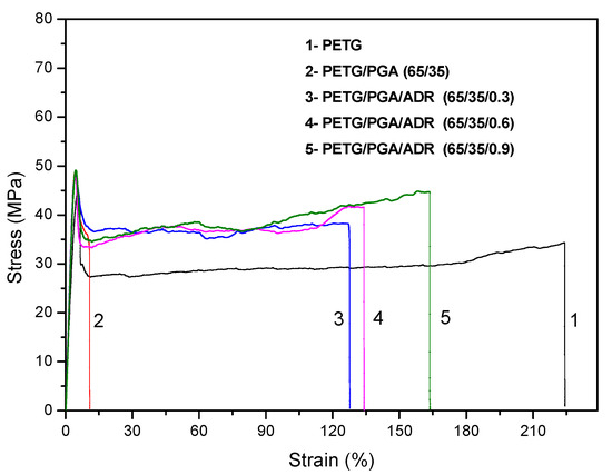 Tensile stress–strain curves for neat PETG and PETG/PGA/ADR (65/35/x) samples.