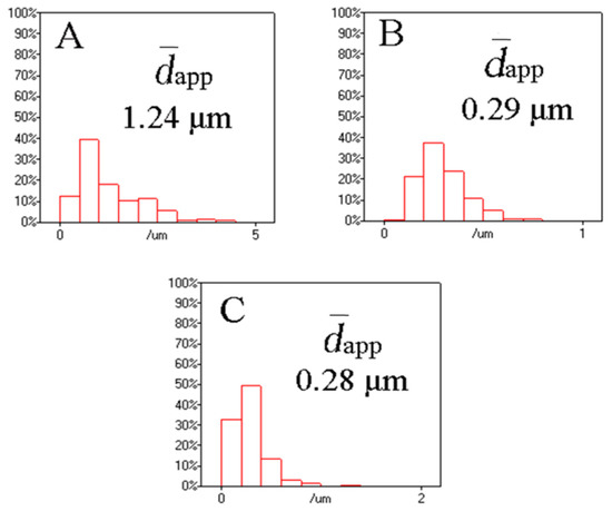 Statistical results for apparent particle sizes of PETG/PGA/ADR (65/35/x; x = 0.3 (A), 0.6 (B), and 0.9 (C)) samples.