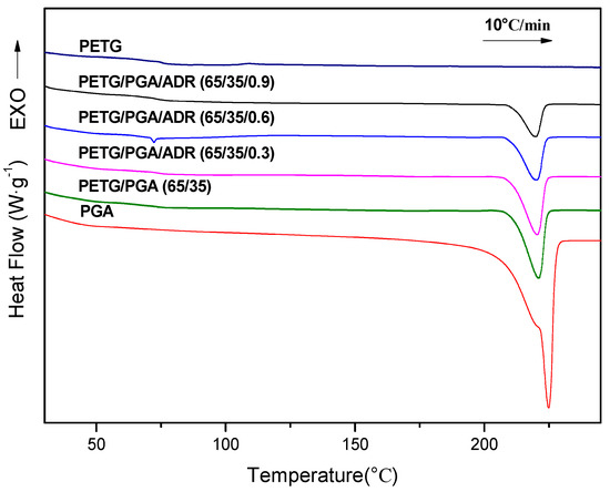 The effect of adding ADR on the crystallization properties of the PETG/PGA (65/35) samples with varying ADR contents was investigated by DSC and WAXD measurements.The heating DSC thermograms of the PETG/PGA/ADR samples are presented in Figure 14, and their corresponding thermodynamic parameters are summarized in Table 5.