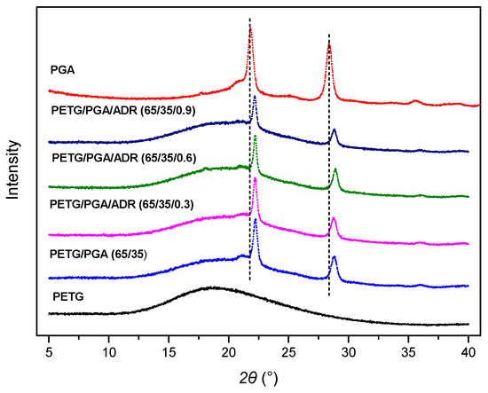 The WAXD patterns of the PETG/PGA/ADR (65/35/x) samples are shown in Figure 15. Consistent with the DSC results, the WAXD patterns of neat PETG showed a dispersive diffraction peak in the range of 2θ = 10° to 35°, suggesting an amorphous nature for neat PETG. The PETG/PGA (65/35) sample showed two shaper peaks at 22.2° and 28.8°, corresponding to the (110) and (020) crystal planes of PGA crystals, respectively. Furthermore, the PETG/PGA (65/35) samples modified with ADR showed a gradual decrease in the peak intensities of the PGA component with an increase in ADR content. This could be attributed to the decrease in the crystallinity of the PGA component resulting from chain extension/branching reactions between PGA, PETG, and ADR.