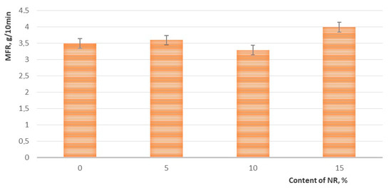 As the experiment showed, the addition of natural rubber did not significantly affect the MFR of PLA/NR samples; only when the NR content was 15 wt.% did the MFR increase by 0.5 g/10 min, which was a completely acceptable change in MFR for polymer compositions.