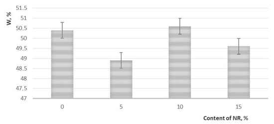 Degree of water absorption (W, %) of samples of nonwoven PLA/NR fiber containing 0, 5, 10, and 15 wt.% of NR.
