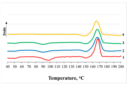 Melting thermograms of nonwoven PLA/NR fibers with different NR contents: (1) 0, (2) 5, (3) 10, and (4) 15 wt.%. 180 days of water degradation. DSC method.