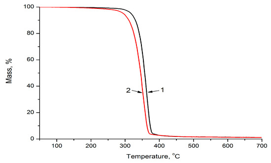 TGA thermograms of PLA/NR samples with 10% wt. of NR content: 1—initial, and 2—after 180 days of hydrolytic degradation.