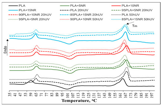 From the DSC data, it follows that when exposed to UV radiation, the glass transition temperature (Tg) of the PLA changes ambiguously. In pure PLA, the Tc increases by 7 °C, while the Tm increases by 6 °C and the degree of crystallinity increases by 7%. In samples of nonwoven fiber PLA/NR of the PLA, the Tg changes slightly, and the melting and crystallization temperature decreases by 2–3 °C.