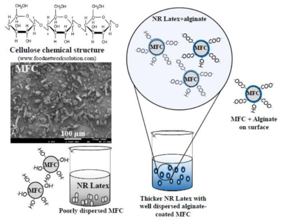 Schematic illustration of preparation of MFC–NR composites by latex compounding in the presence of alginate.