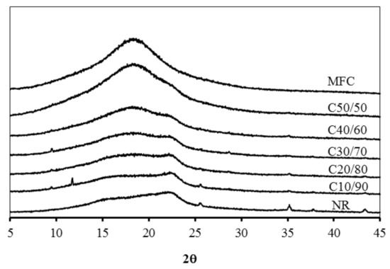 XRD patterns of MFC, MFC–NR composite, and NR films.