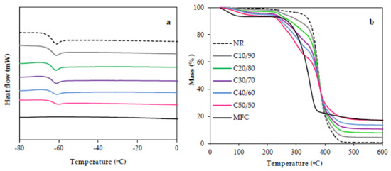 Glass transition temperatures (Tg) of MFC, NR, and MFC–NR films obtained from the endothermic peaks in DSC thermograms (Figure 5a) are listed in Table 2. The NR film became glassy at the temperature of −64.7 °C. For the composite films, range of Tg was quite similar (−63.4 to −64.5 °C) regardless the different composition of MFC and NR. Therefore, the reinforcement did not significantly affect the Tg as the consequence of the negligible chemical interaction between the MFC and NR segments confirmed by the FTIR result. The Tg values predominantly related to the nature of the polymeric matrix were reported [5,29].