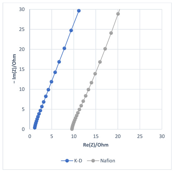 The through-plane ionic conductivity was measured by impedance spectrometry between 1 Hz and 6 MHz using an impedance spectrometer, Biologic VSP300 (Biologic, Seyssinet-Pariset, France). The amplitude of the oscillating voltage was 20 mV. After immersion in the buffer during 24 h at 25 °C in a thermoregulated oven and after removing the buffer excess on the surface, the samples were measured at 25 °C in humidified conditions inside a Swagelok cell with two stainless-steel electrodes. The sample resistance, R, was obtained from typical impedance spectra (Figure 2) using the intercept with the real axis. The ionic conductivity, σ, was calculated using the equation: