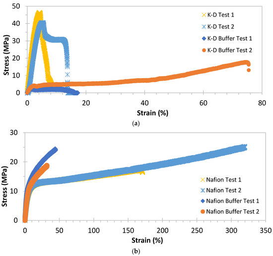 Typical stress-strain curves at relative humidity (RH) = 40% ± 10% and after immersion in buffer solution of (a) K-D and (b) Nafion 212 membrane.