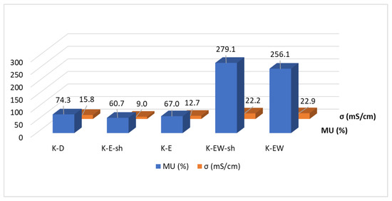 The effective mobility u(K+) (in cm2 V−1 s−1) is defined according to Equation (4) by the measured ionic conductivity σ(K+) (expressed in mS/cm, Table 2) and the calculated ion concentration c(K+) (in mol/L):