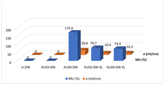 Figure 6 shows the ionic conductivity as a function of the mass uptake (MU). The apparent maximum at intermediate values of MU was reported before in other ionomers [47]. It is related to antagonistic effects of a cation concentration increase that simultaneously reduces the cation mobility so that an optimal value is obtained for an intermediate value of concentration.