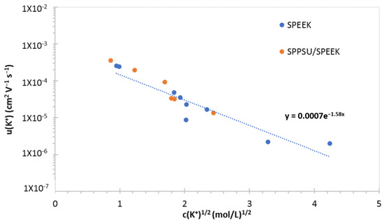 The exponential dependence of the cation mobility as a function of the square root of cation concentration has been previously related to the conditions of ionic motion in nanometric ion conduction channels, where the mobile ions migrate with immobile counterions grafted on the channel walls [50,51,52]. The extrapolation to c(i) = 0 gives the cation mobility at infinite dilution (u(K+) = 7 × 10−4 cm2 V−1 s−1) that can be compared with literature data of K+ mobility in aqueous solution (u(K+) = 7.6 × 10−4 cm2 V−1 s−1) [53,54].