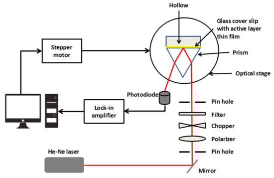Optical setup of surface plasmon resonance spectroscopy.