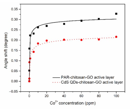 The SPR analysis began by finding the SPR curve of the thin films when in contact with Co2+ solution at 0.01, 0.1, 1, 5, 10, 20, 40, 60, 80, and 100 ppm concentrations. The resonance angle then was determined from each of the SPR curves, as shown in Figure 4a []. The SPR curves for both PAR–chitosan–GO and CdS QD–chitosan–GO thin films were shifted to the right when Co2+ solution was used, with the lowest detection of 0.01 ppm for both thin films. This result proved that the binding event did occur between the Co2+ and the modified gold thin films [].