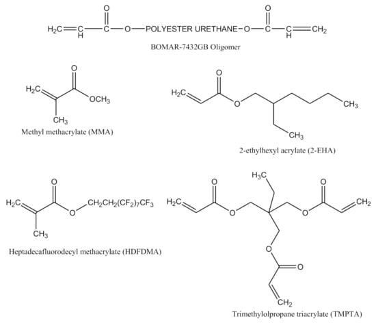 In this study, urethane diacrylate oligomer (BOMAR™ 7432-GB) was generously supplied by Dymax Corporation Solutions while 2-ethylhexyl acrylate (2-EHA), methyl methacrylate (MMA), trimethylolpropane triacrylate (TMPTA) and heptadecafluorodecyl methacrylate (HDFDMA, 97%) were all obtained from Sigma Aldrich, Sdn. Bhd., Kuala Lumpur, Malaysia. The photoinitiator, Chivacure® 300 was obtained from Chitec Technology Co., Ltd., Taiwan. All the chemicals were used without further purification and their structures were shown in Figure 1.