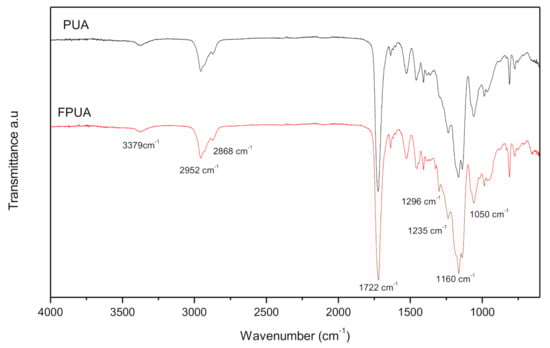 The structures of the prepared FPUA coating were confirmed by ATR-FTIR analysis. Figure 2 depicts the spectra of pristine PUA and FPUA. It was found that in both spectra, there was a characteristic peak of N-H at 3379 cm−1 and C-H aliphatic stretches bands at 2952 cm−1 (methyl group, -CH3) and 2868 cm−1 (methylene group, -CH2) were also observed. The strong absorption around 1722 cm−1 in the spectra corresponded to the vibration of C=O group. The absorption band at 1050 cm−1 indicates C-O-C in the formulation. Besides that, the stretching vibrations of -CF2 group at 1160 cm−1, -CF3 group at 1235 cm−1, 1296 cm−1 were all detected in the FPUA coating [,,].