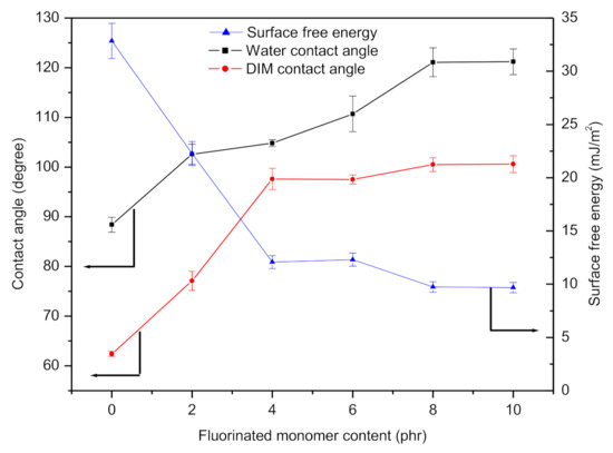 Contact angle (°) of the coating and their respective surface free energy (mJ/m2) at different fluorinated monomer content (phr).