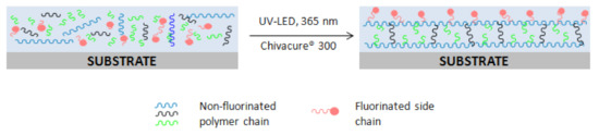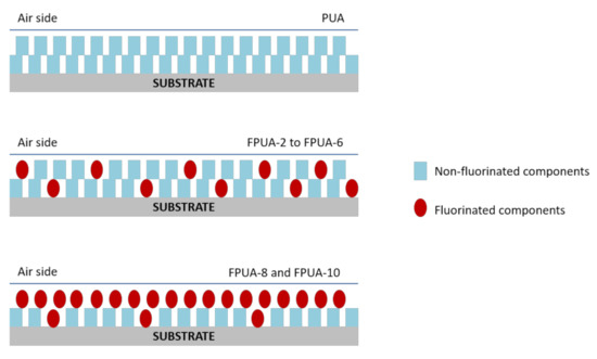 To further clarify the facts of the reconfiguration and accumulations of fluorinated side chains at the surface during the photopolymerisation, Figure 7 exhibits the schematic illustration of the possible non-fluorinated components and fluorinated side chains reconfiguration at the coating surface (air side surface). In the meantime, phase separation involving fluorinated and non-fluorinated components also occurred and as a result improving the roughness of the coating surface []. Straightforwardly, the chemistry of the fluoroalkyl group itself is superior to revolutionise the wetting behaviour of the surface (hydrophilic to hydrophobic) which is mostly attributed to its exceptionally low surface free energy property.