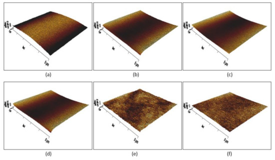 Atomic force microscopy (AFM) of the UV-LED curable polyurethane coating: (a) pristine PUA; (b) FPUA-2; (c) FPUA-4; (d) FPUA-6; (e) FPUA-8; and (f) FPUA-10.