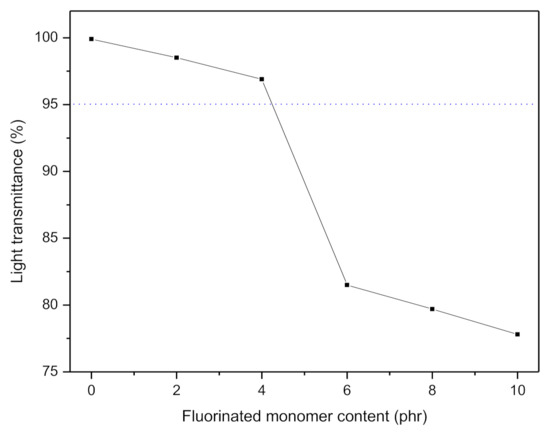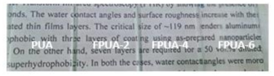 Figure 8 shows the optical transparency of the PUA, FPUA-2, FPUA-4, and FPUA-6 coating being placed on a paper. There was no noticeable difference observed through naked eyes though. But based on Figure 9, the light transmittance was changed with the addition of HDFDMA. The light transmittance of PUA was nearly 100% (transparent) at 550 nm and gradually decreased as the HDFDMA added increased. The transmittance drastically drops at 6 phr (from 97% to 82%). The difference in transmittance could be due to the increase in the fluoroalkyl group and microphase separation, which follow the increasing content of HDFDMA monomer []. Accordingly, this situation led to poor compatibility of HDFDMA and urethane oligomer, which results in cloudy solution formation. Ganesh et al. [] also reported that the relatively low solubility of fluorinated monomer within its medium (co-monomers and oligomer mixture) caused its segregation and thus affected the light transmittance property.