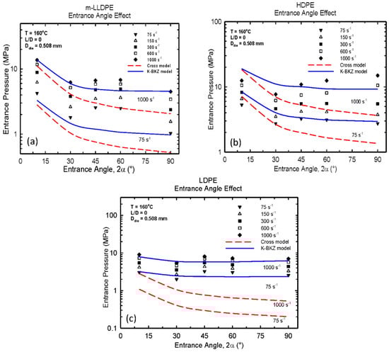 Many studies have previously attempted to examine the origin of entry pressure and its prediction for various polyethylenes [31,32,33,34,35,36,37,38]. Significant under-estimation was reported in all these studies that have raised questions with respect to the appropriateness of the constitutive equations used and/or the adequate rheological data used to fit the model parameters, particularly those that control the extensional behavior of these polymers. The problem of predicting the end pressure for LDPE was solved satisfactorily at very high shear rates (up to 1000 s−1) for the first time by taking in to account the effect of pressure (mainly) and temperature on viscosity [39]. The authors pointed out the importance of considering in detail the significant effects of pressure and temperature on viscosity (including possible viscous dissipation effects) as well as the importance of extensional viscosity data to predict correctly the entry pressure. Typical results from the simulations are shown in Figure 2a–c for three polymer melts, a metallocene polyethylene (m-LLDPE), a high-density polyethylene (HDPE), and a low-density polyethylene (LDPE), respectively. Numerical results for the lowest and highest apparent shear rates of 75 s−1 and 1000 s−1 are only presented here for the sake of clarity. Several observations can be made: (i) the use of a viscous model (Cross model) significantly underpredicts the entry pressure as such models neglect the important viscoelastic and extensional rheological effects. On the other hand, the use of the K-BKZ model is capturing adequately well the entrance pressure as a function of the contraction angle for all three polymers. As the contraction angle increases, the extensional components are having a stronger effect, thus increasing the discrepancies between predictions from a purely viscous model and the measured experimental data [39]. Finally, comparing the entrance pressure between the three types of polyethylene, the authors concluded that it scales with the extensional viscosity of the polymer. For example, the LDPE (branched polyethylene) possesses the highest entrance pressure due to the significant strain-hardening effects originated from its branched structure.