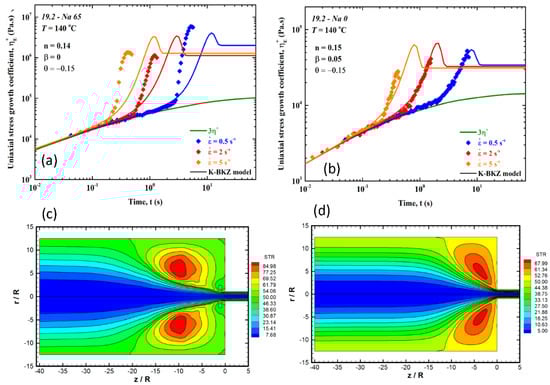 (a) The uniaxial tensile stress growth coefficient in start-up of uniaxial extension for sample 19.2-Na 65 at 140 °C; (b) the uniaxial tensile stress growth coefficient in start-up of uniaxial extension for sample 19.2-Na 0 at 140 °C. The continuous lines are fits of the K-BKZ/Wagner model to the experimental data. (c) Flow patterns (streamlines) for the copolymer 19.2-Na 65 at 140 °C for a die with L/D = 33 at the apparent shear rate of = 400 s−1. (d) Flow patterns (streamlines) for the copolymer 19.2-Na 0 at 140 °C for a die with L/D = 33 at the apparent shear rate of = 400 s−1. These figures clearly show that a higher extensional viscosity produces a larger and stronger vortex.