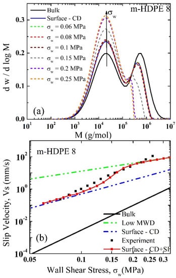 (a) The MWDs of bulk (solid line), surface-CD (concentration driven migration given by Equation (6) with only the first term), and the combined surface and shear-driven migration at various wall shear stress values (Equation (6)); (b) the slip velocity of m-HDPE-8; the experimental results (black squares), the bulk and low MWD are calculated based on Equation (5) with no migration effects, the concentration driven migration (surface CD) (Equation (6) only the first term) and the combined concentration and shear-driven migration (CD+SI) slip velocity (red squares connected with a continuous line) using Equation (5) coupled with Equation (6).