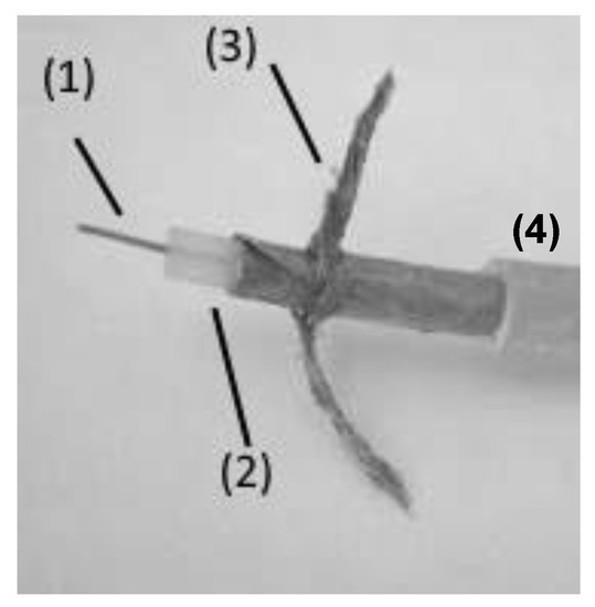 The samples investigated in this paper are low-voltage signal coaxial cables RG 59B (75 Ω of characteristic impedance, 400 V max operating voltage) manufactured by Alcatel, Lyon, France, which are commonly found in old NPPs, with insulation made by crosslinked polyethylene (XLPE). The structure of the analyzed cables is reported in Figure 1. Specimens are made of four concentric parts: