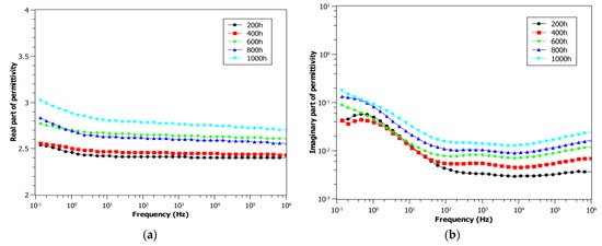 Real (a) and imaginary (b) part of the permittivity for cables aged at 85 °C and 0.42 kGy/h as a function of aging time.
