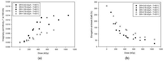 As can be seen from Figure 3a, imaginary permittivity increases with the increasing of dose, as expected, but the different aging conditions deeply influence the dielectric response of the material. In particular, at 85 °C and at high dose rate (1.06 kGy/h), a smaller variation of ε” at the same dose can be observed, with respect to lower dose rates. At lower temperature, on the contrary, the values of ε” depend only on the total dose and not on the dose rate. Figure 3b shows that EaB decreases with the increase of the absorbed dose, but a steep reduction is observed at higher dose rates and temperatures.