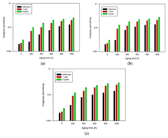 Imaginary permittivity at 100 kHz as a function of aging time at 0.42 kGy/h (a), 0.76 kGy/h (b), and 1.06 kGy/h (c), 85 °C, measured immediately after aging (reference), after 1 year and 5 years of storage in ambient conditions.